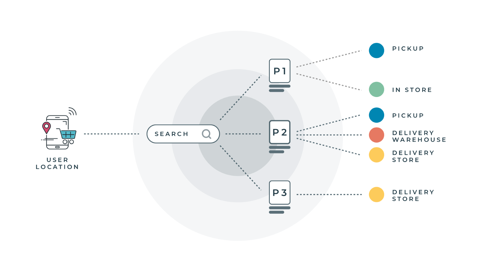 Instead of offering only the products available from one pre-selected shop, we would make products available from several stores near the customer.