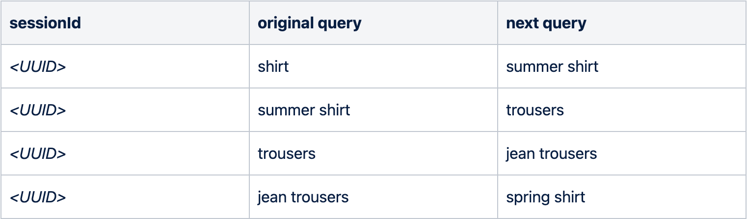 That session’s information is then stored in our data lake in the form of direct pairs as original query → next query. It is worth reiterating that Empathy.co is strongly committed to privacy and creates products that are both trustworthy and evoke trust. Therefore, that UUID is nothing but a random identifier that denotes each session uniquely, but it does not contain any personal information.