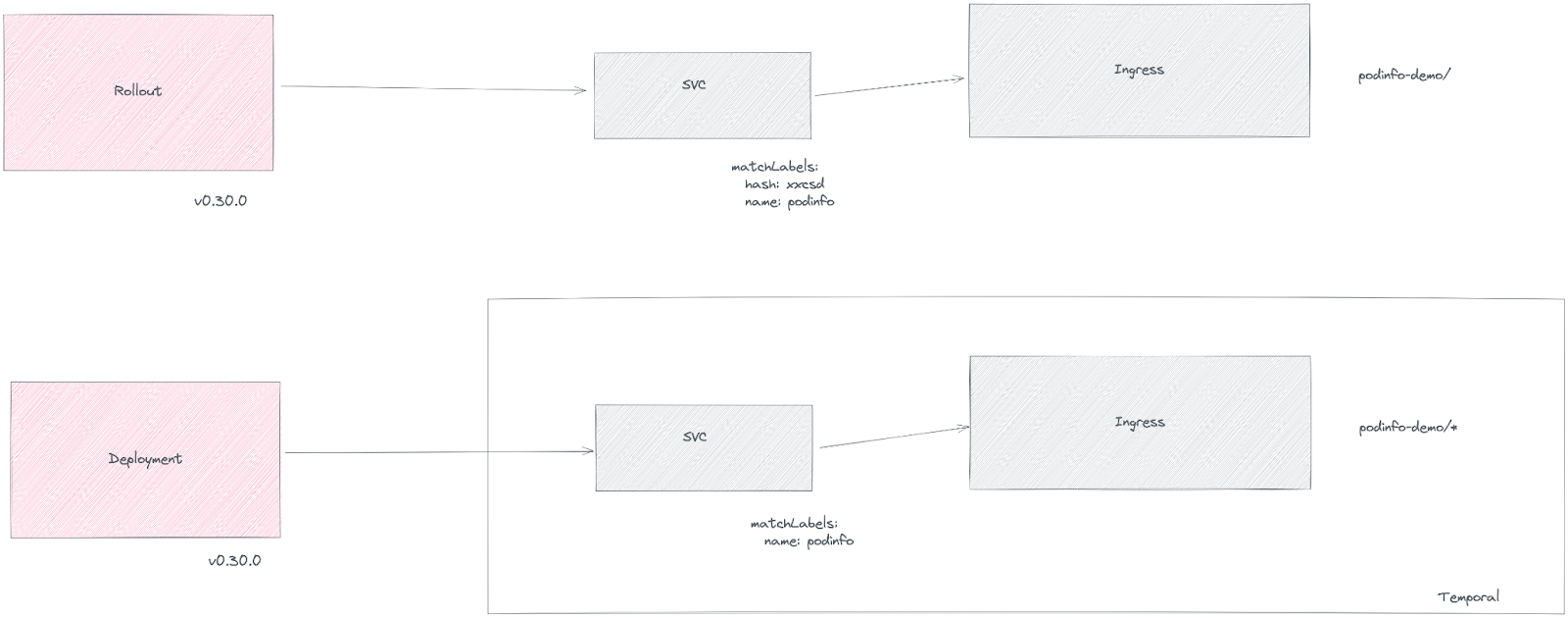A temporal ingress and service will be located to avoid downtime and ensure correct behavior during the migration, because rollouts introduce a hash label in the selector to route the traffic.