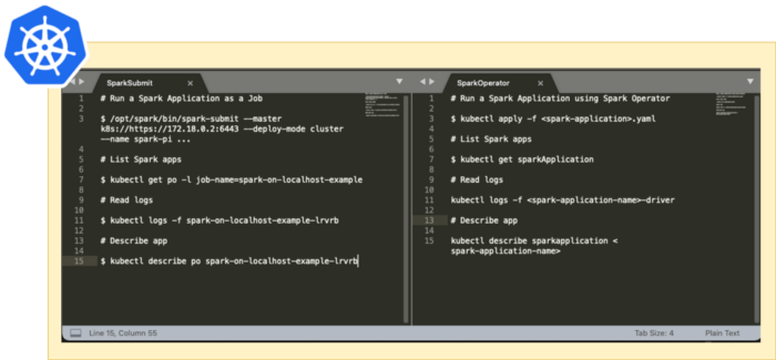 The image above shows the main commands of Spark Submit vs Spark Operator.
